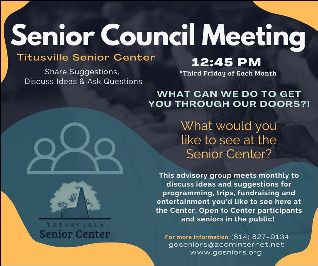 The mission of the Titusville Area Senior Citizens Corporation is to assure that older adults, remain active, independent, healthy and involved in the community. |