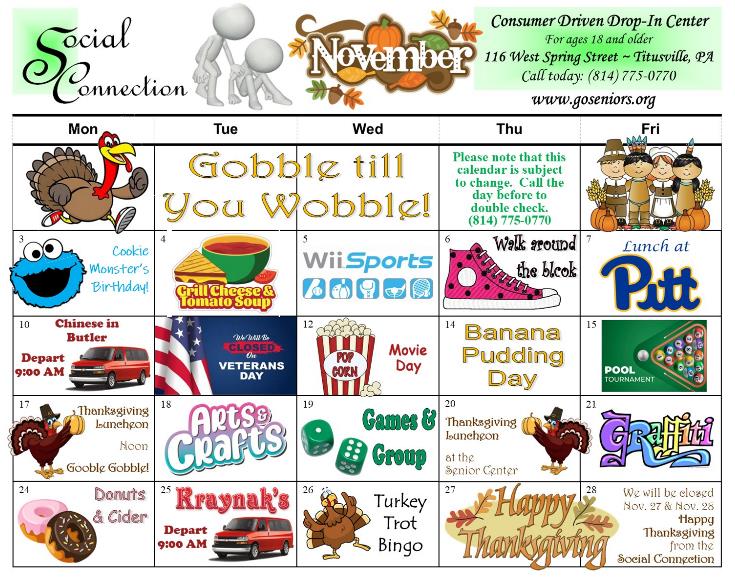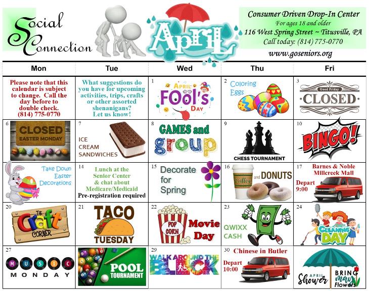 Titusville Social Connection is administered by the Titusville Area Senior Citizens Corporation. Funding is received in part from Crawford County Human Services. |